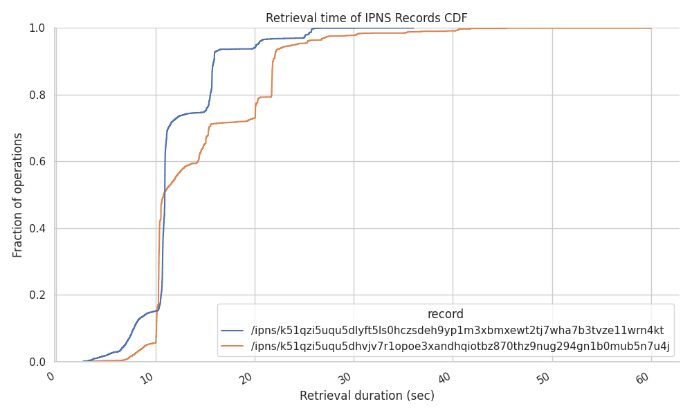 - Correctness and reliability: With a quorum of 16, IPNS consistently returned the correct record values, even under network churn and long TTL intervals.