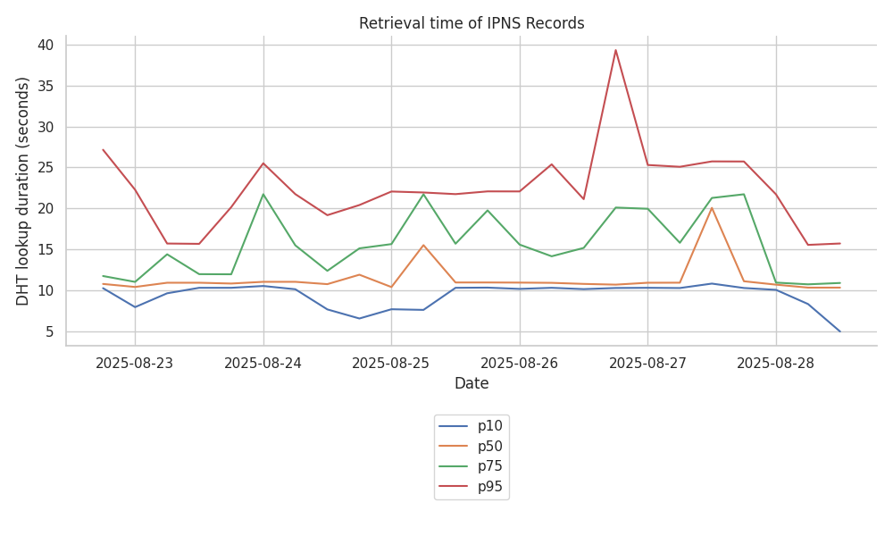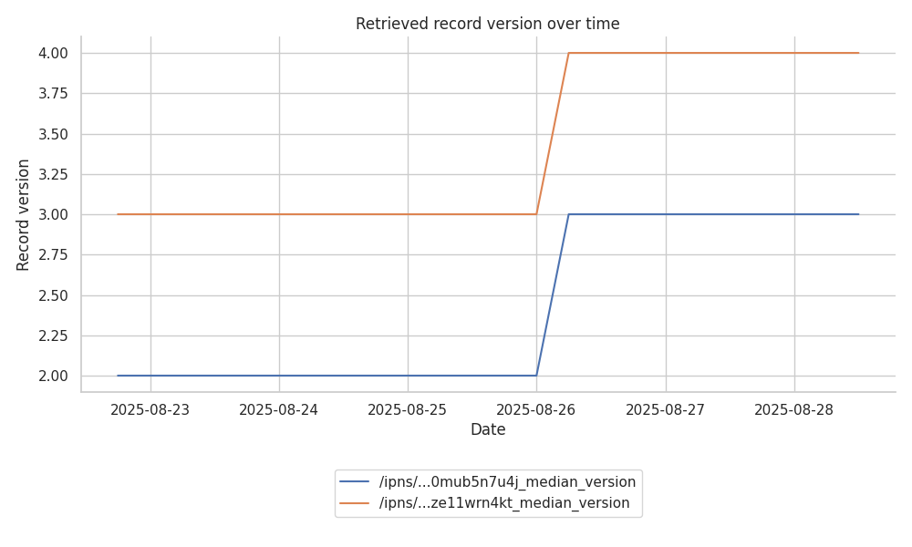- Network resilience: New versions of the IPNS records are successfully propagatedeven after days of the original publication. This highlights robustness despite the dynamics of the Amino DHT.